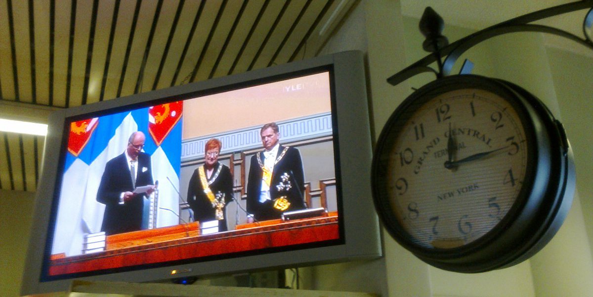 Eduskunnan puhemies Eero Heinäluoma puhuu vieressään väistyvä presidentti Tarja Halonen vieressään alkava presidentti Sauli Niinistö. Kuvan kello käy Suomen aikaa Café Laukaassa Keski-Suomessa ja viiden minuutin päästä lähtee bussi, johon kuvaajan Pertti Mannisen on kiirehdittävä. Kellossa: GRAND CENTRAL TERMINAL NEW YORK.