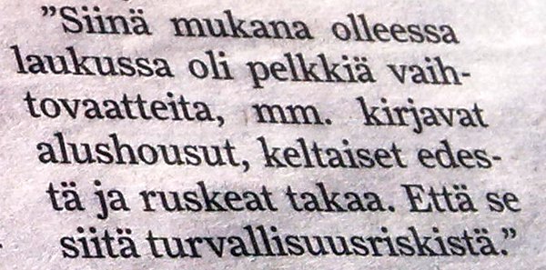"Laukussa kirjavat alushousut".