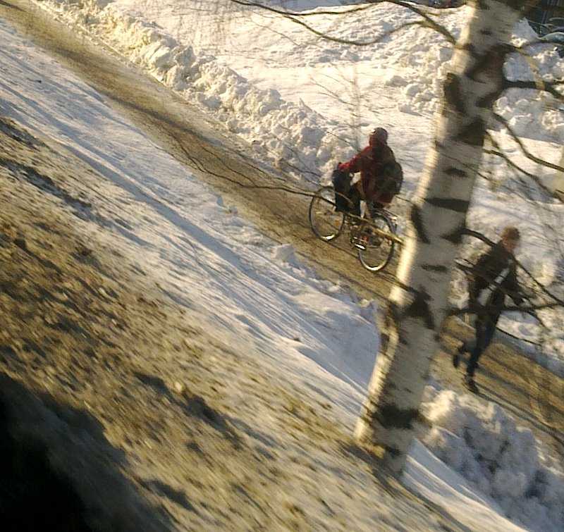Kansainvälisen naistenpäivän pyöräilyä kirkkaan kirpeänä pakkaspäivänä Suomessa.