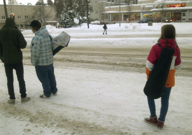 Lukijan kuva: "Katso tuolla on Hakkarainen!"Kansanedustaja Teuvo Hakkarainen Jyväskylän yössä Kauppakadulla aikaisin sunnuntaina 2011-11-27 noin 03:n aikaan sankan fanijoukon piirittämänä. Lähetetyssä kuvassa keskustelijoiden kasvoja on hiukan pehmennetty. Kuva: H.N. - Katso myös! Samassa puserossa. |